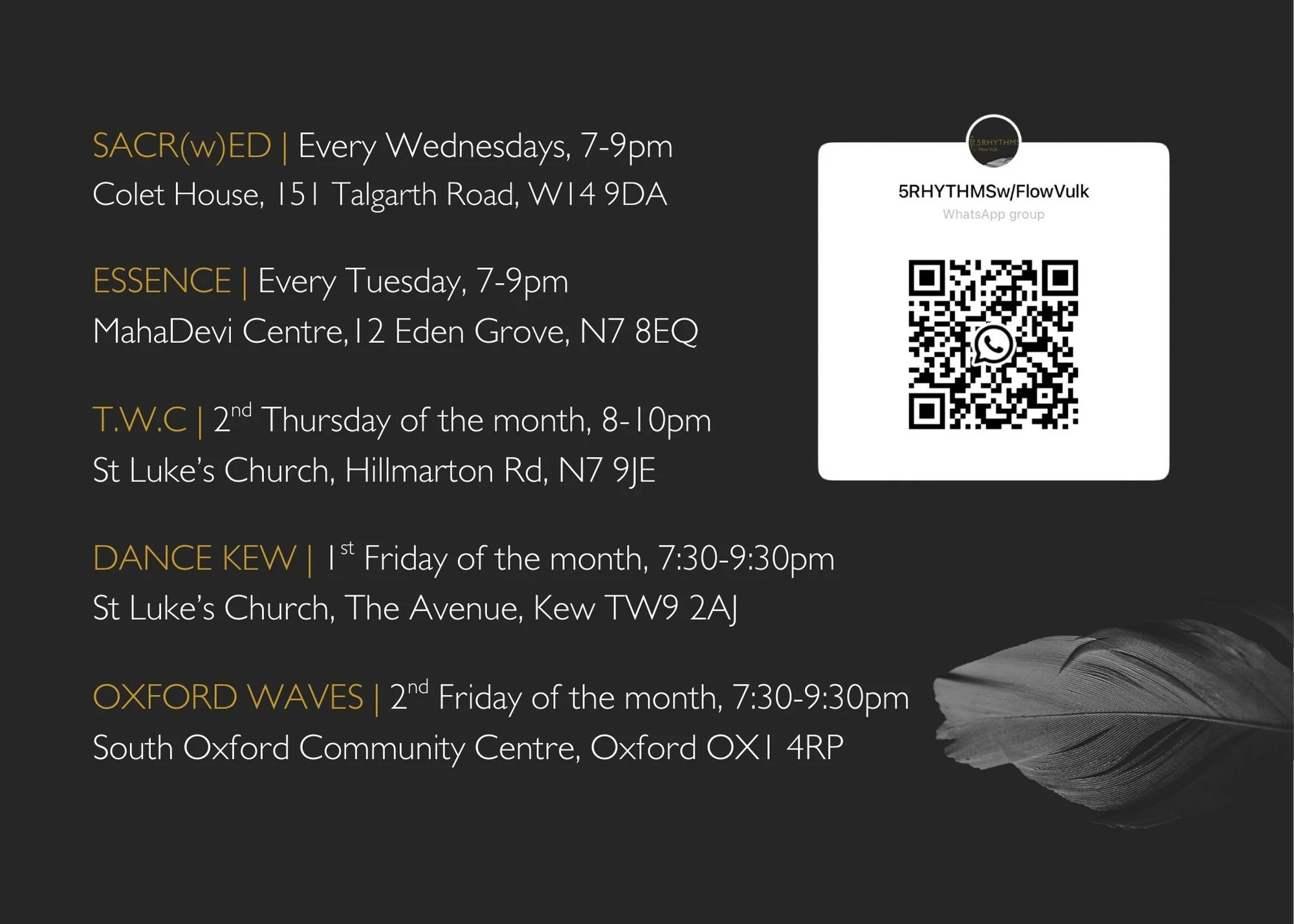 All classes are pay on door card or card option | All classes are sliding scale: £12 / £14 / £16 / £18 | All new comers £10